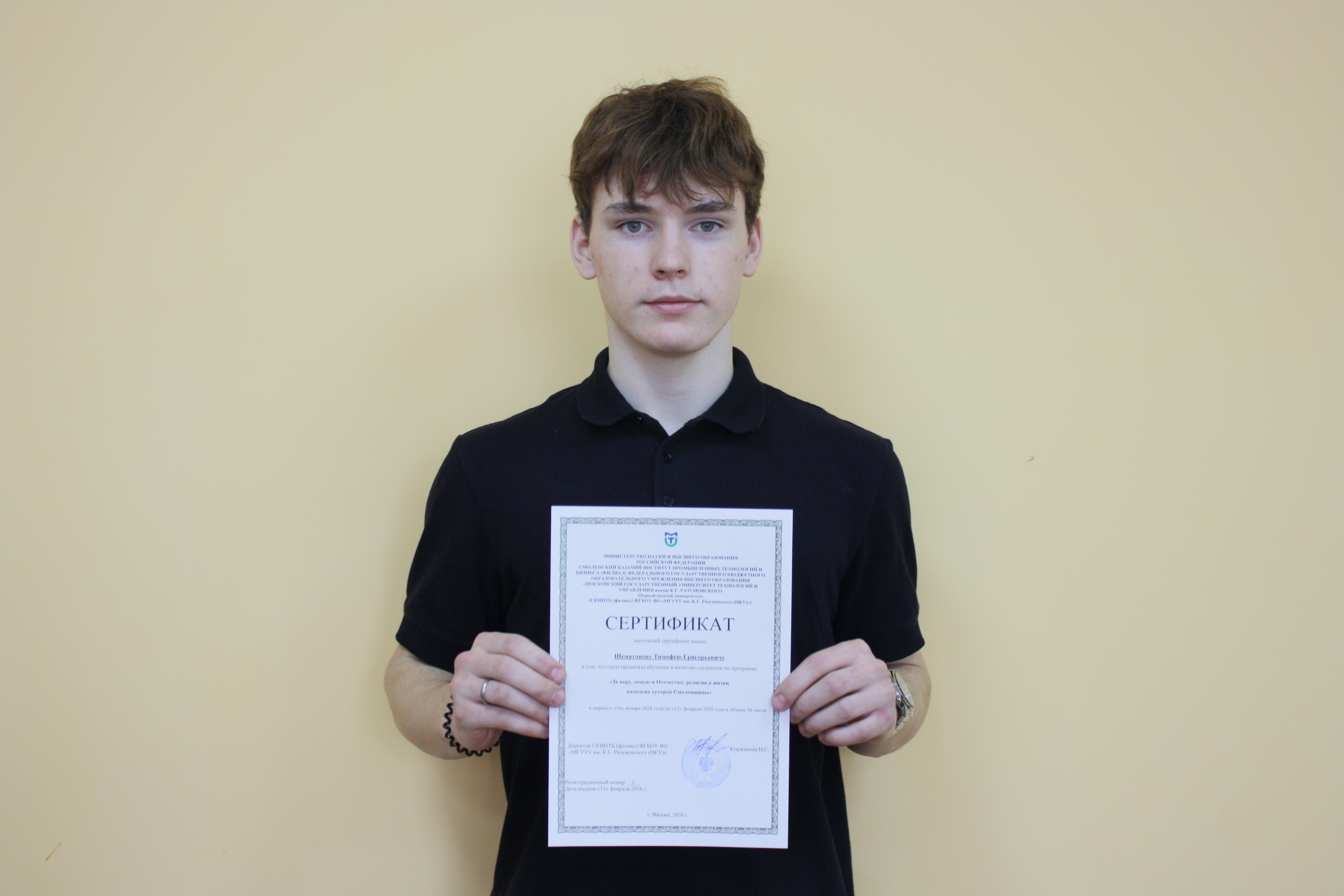 Наш студент и разработчик маршрутов Тимофей Шематонов продолжает углублять знания в тематике проекта «СтягЪ». Новый сертификат от Смоленского казачьего института (МГУТУ им. Разумовского) — это программа «За веру, семью и Отечество: религия в жизни казачьих хуторов Смоленщины».