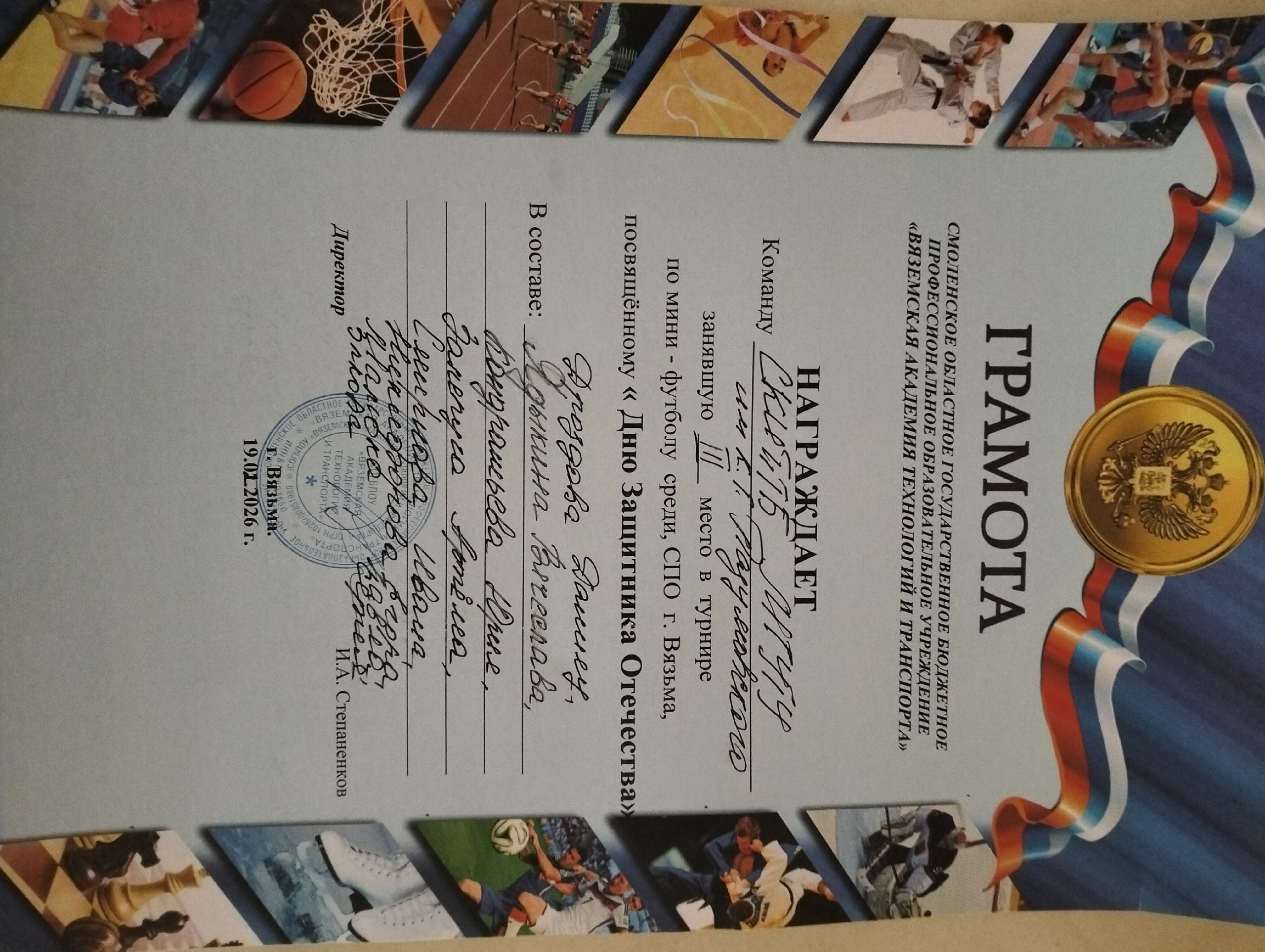 19 февраля сборная СКИПТБ по футболу выступила на турнире среди учебных заведений Вязьмы. Соревнования прошли в ФОКе, и наши ребята показали характер — итоговое 3 место!